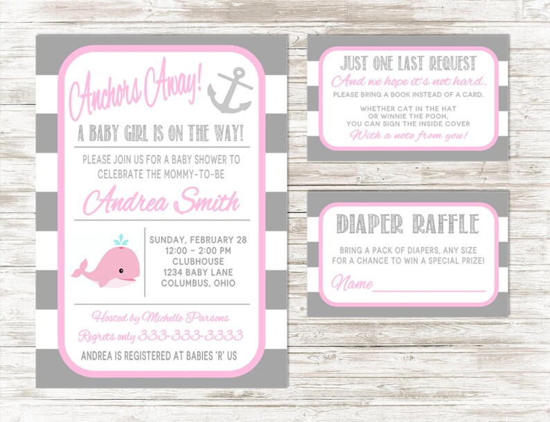 Anchor S Away Nautical Whale Daughter Baby Shower Invitation Add Ons Digital Diaper Raffle Volume Insert Pink Grayness Baby Girl